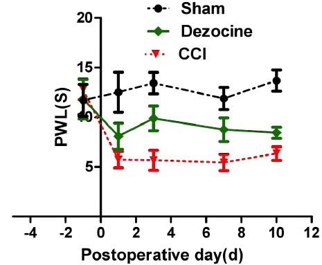 Figure 1: Changes of PWL after injection of dezocine on CCI rats. Rats were administered with dezocine one day before CCI, and then PWL was measured. Following administration of dezocine, PWL was significantly increased comparing to that in the NS group (*P < 0.05).