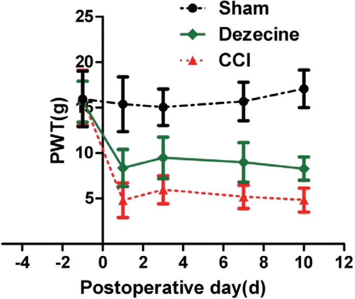 PWT was utilized to measure mechanical allodynia. Mechanical allodynia was induced by CCI, as evidenced by the reduction of PWT (figure 2). CCI rats receiving intraperitoneal injection of dezocine, PWT was increased markedly in the dezocine group comparing to the NS group (P < 0.05), which suggested an attenuation of allodynia by dezocine (figure 2). Similar to PWL, the improvement of PWT was found during the entire experiment period. Taken together, the anti-nocicetion effect by dizocine started immediately after administration lasted for 10 days with out signs of tolerance.