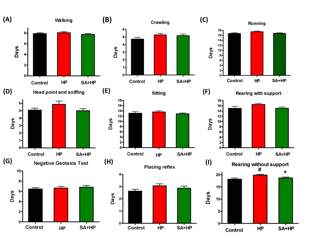 Figure 4: SA showed no statistical improvement on some of the development parameters. There are no statistical significance on some of the development parameters such as walking (A), crawling (B), running (C) , head point and sniffing (D), sitting (E), rearing with support (F), negative geotaxis test (G) and placing reflex (H), though hypoxic pups also showed delayed appearance compared to control and SA groups. Hypoxia pups showed delayed appearance of rearing without support at day 19.86±0.29 compared to day 18.18±0.4435 in control group. Hypoxic pups treated with SA presented better performance than hypoxic pups at day 18.69±0.3843(I), which is similar to the control group (# p < 0.05 HP vs. Control ; * p < 0.05 SA+HP vs. HP. SA: Salvinorin A; HP: Hypoxia).