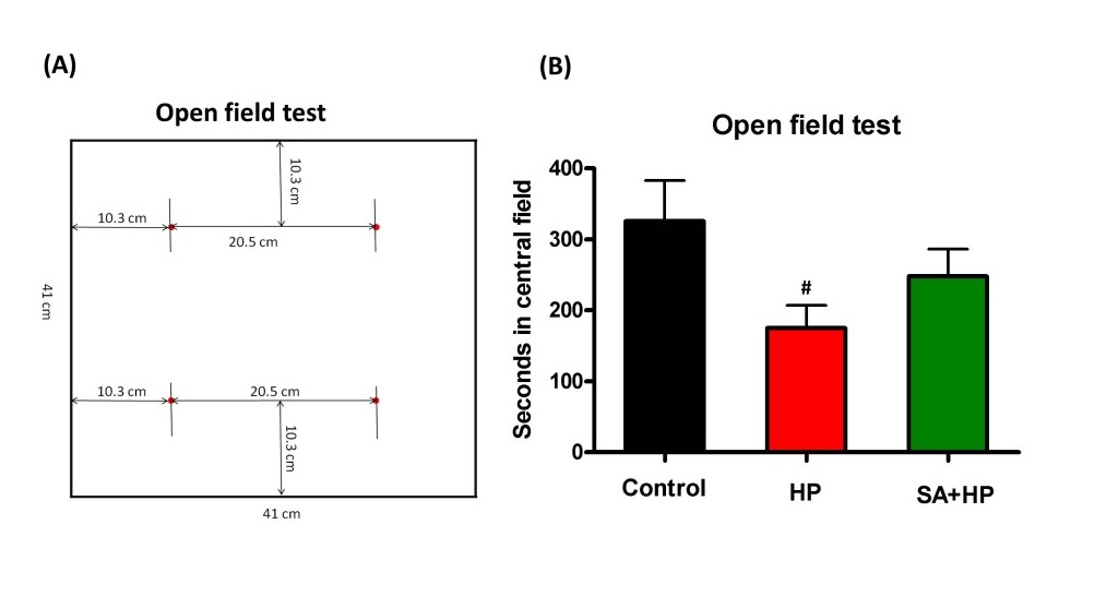 Figure 5: SA did not improve the outcome of open field test significantly. (A) The left figure showed the sketch of the open field test. Mice were individually placed in a 41cm (L) x 41 cm (W) x 30cm (H) plastic box. "Central part of the area" was defined as a 20.5cm x 20.5cm square in the center of the box. The rest of the area was defined as "peripheral part of the area". The time each mouse spent on exploring the central part and periphery part of the area and the number of rearing behavior were recorded respectively in the first 5 minutes and 30 minutes. (B)The seconds in the central field was recorded in open field test at P21 which showed that HP significantly decreased the seconds compared to the control and SA administration increased seconds in the central filed after hypoxia, but the difference was not statistically significant (# p < 0.05 HP vs. Control. P: postnatal; SA: Salvinorin A; HP: Hypoxia).
