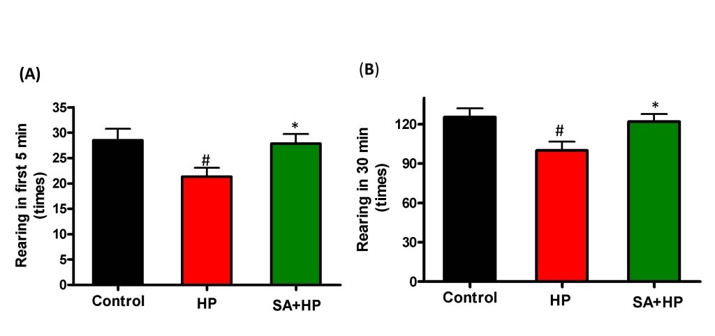 Figure 6: SA improved rearing activity at P21 significantly. Rearing test at P21 in the first 5 min and 30 min was impaired by hypoxia and such impairment was not observed with SA administration which was similar to the control group, indicating that SA could improve some of the hypoxia induced long term neurological deficit (# p < 0.05 HP vs. Control ; * p < 0.05 SA+HP vs. HP. P: postnatal; SA: Salvinorin A; HP: Hypoxia).