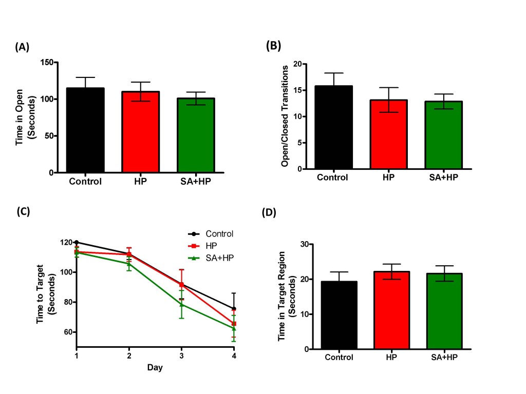 Figure 7: SA did not improve the long term anxiety level and spatial memory. As for the elevated zero maze to detect the anxiety level and locomotor activity, there were no significant differences in the percentage of time spent in the open arm (A) and open/closed transitions (B) of the maze between SA administration and hypoxia alone groups .The Barnes maze task was used to assess spatial reference memory. In our study, there was no significant difference between the groups of the time to target (C) and time in target region (D). There was also no difference between the control and HP groups (SA: Salvinorin A; HP: Hypoxia).