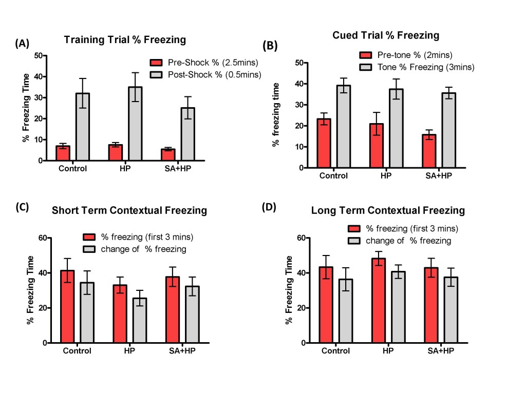 Figure 8: SA did not change the long term memory deficit. All groups learned at similar rates and there was no significant difference in the long-term behavior of fear conditioning test. Control group showed no impairment compared to HP group in the training trial (A), cued trial (B), short term (C) and long term (D) contextual freezing behavior (p > 0.05). Pretreatment with SA did not change the fear memory compared with HP and Control mice (p > 0.05; SA: Salvinorin A; HP: Hypoxia).