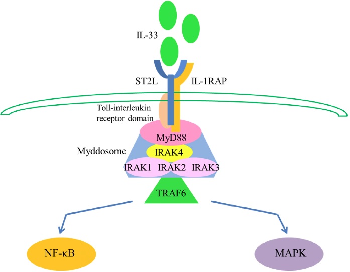 IL-33 signaling starts from activation of cytoplasmic Toll-interleukin receptor domain which attracts the adaptor molecule myeloid differentiation primary response gene 88 (MyD88) [10, 24]. Then interleukin receptor-associated kinase 4 (IRAK4) is gathering to MyD88, followed by the interaction of myddosome which is composed of IRAK1, IRAK2, and/or IRAK3 [25, 26]. This myddosome then combines with tumor necrosis factor receptor-associated factor 6 (TRAF6), which is crucial for signal propagation [27] and further activates transcription factors NF-κB or mitogen-activated protein kinase (MAPK) [2, 9]. (Figure 1).