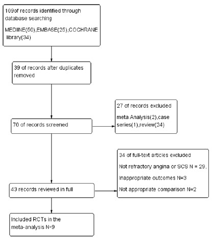 We searched several electronic databases including EMBASE, The Cochrane Library, MEDLINE, and The Cochrane Central Register of Controlled Trials from their inception to March 2016 for the selection of related articles. Our search terms included "spinal cord stimulation" and its synonyms, "refractory angina" and its synonyms, and the two terms combined. The electronic databases were searched by two independent investigators (Shaocheng Wang and Qixian Li). The abstracts of all articles identified as potentially related were retrieved and examined in the study selection process. Repetition of published trials was included only once.