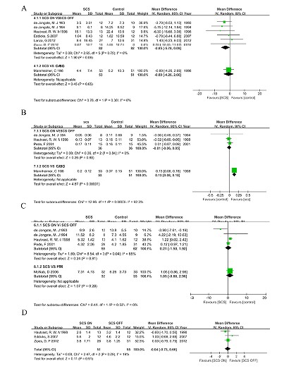 VAS was recorded in three studies [14, 15, 17], and the pooled analysis did not demonstrate statistical significance when comparing 'SCS ON' to 'SCS OFF' (WMD: -0.04, 95% CI: [-0.73, 0.66], p=0.91, test of heterogeneity: χ2 =2.47, I2 =19%, p=0.29) (Figure 5D).