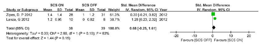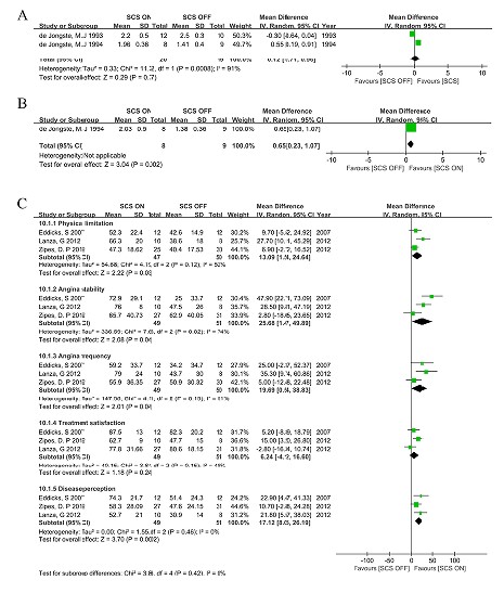 Five studies presented data on HRQOL including the daily activity score (ADL), social activity score (SAS), and Seattle Angina Questionnaire (SAQ). ADL was recorded in two studies [11, 13] that compared 'SCS ON' with SCS OFF', but the pooled analysis did not achieve statistical significance (Figure 6A).