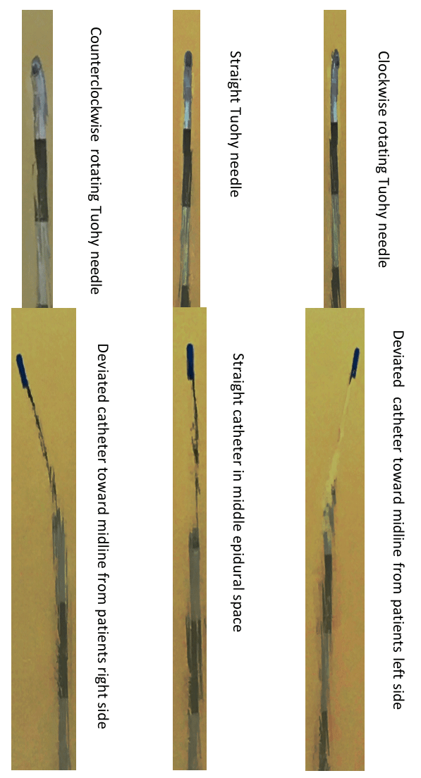 A supplemental video with 4 parts of experiments is included in this study to demonstrate the maneuver of Tuohy needle and epidural catheter in the gelatin model in lateral and AP (anteroposterior) views (https://youtu.be/oo_U0rwI2zI). Please open the link for self-explanation. Part 1 (lateral view) and Part 2 (AP view) demonstrate an un-rotated Tuohy needle and a straight advancing epidural needle in the gelatin model. Part 3 and Part 4 show the rotated needles and deviated catheters in the gel in AP view.