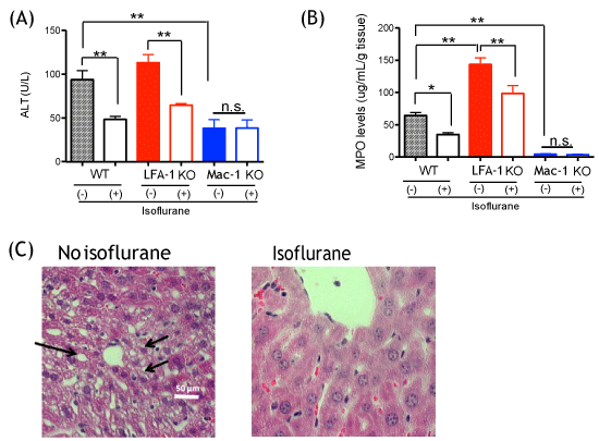 We exposed a group of mice to 1% isoflurane for 2 hours after CLP surgery and assessed liver injury and neutrophil recruitment at 12 hours after CLP. Isoflurane attenuated the elevation of ALT and recruitment of neutrophils in WT mice (Figure 3A and Figure 3B). ALT level of LFA-1 KO mice was comparable to that of WT mice, and isoflurane exposure attenuated ALT level and neutrophil levels in liver in LFA-1 KO mice as well (Figure 3A and Figure 3B). In contrast, Mac-1 KO mice showed lower ALT values and neutrophil levels than WT and LFA-1 KO mice at 12 hours after CLP in isoflurane non-exposure experiments, and isoflurane exposure did not affect them, suggesting that the reduction in ALT and neutrophil recruitment by isoflurane in WT mice occurred via its impact on Mac-1 function. We previously showed that isoflurane bound to and inhibited Mac-1 in vitro [21], compatible with our in vivo finding here. In line with the previous results, isoflurane exposure group showed less injury in liver on histology, demonstrated as less hepatocyte vacuolation (Figure 3C).