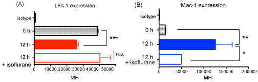 The mean fluorescence intensities (MFIs) of (A) LFA-1 and (B) Mac-1 on peripheral blood neutrophils in WT mice (n = 4-8) at 0 and 12 hours after CLP surgery with or without isoflurane exposure. Statistical analysis was performed using one-way ANOVA with Bonferroni post hoc analysis. *, ** and *** denote p < 0.05, p < 0.01 and p < 0.001 versus time 0 hour, respectively; n.s. = not significant.
