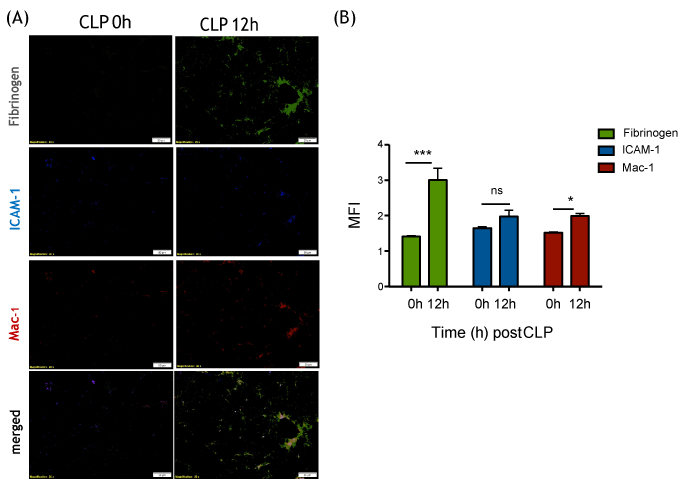 Figure 6: Fibrinogen, ICAM-1 and Mac-1 expression on liver tissues at 0 and 12 hours after CLP surgery (A) Representative immunofluorescence imaging of liver following CLP surgery. Fibrinogen (green), ICAM-1 (blue) and Mac-1 (red) are shown; (B) Fluorescence intensities of fibrinogen, ICAM-1 and Mac-1 were calculated by Image J. Student t-test analysis was performed. * and *** denotes p < 0.05 and p < 0.001, respectively; n.s. = not significant.
