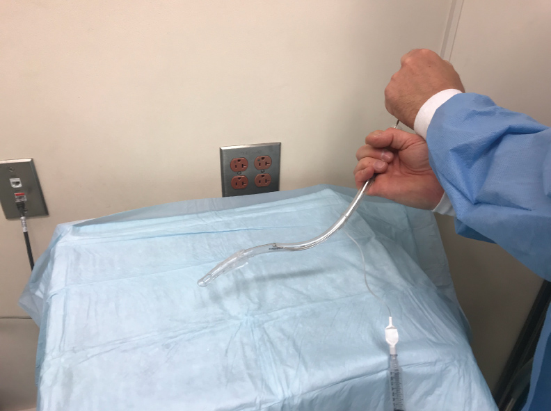 Figure 2: Retro-flexion of the tip of the endotracheal tube (ETT) when it is turned 180 degrees while holding the top of the stylet in place.