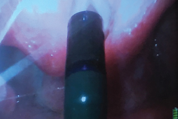 Figure 4: Video-laryngoscope (VL) view of a flexible intubation scope (FIS) passing over the arytenoids. The FIS is ante-flexed by pushing the thumb down.