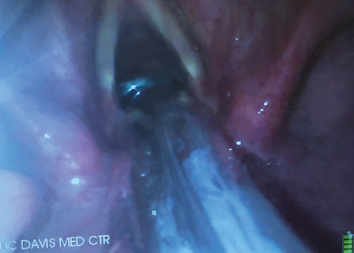 The combined use of the VL with the FIS is also useful for nasal intubations. When the neck has not been cleared in patients with mandibular fracture this technique allows the passage of the nasal ETT with minimal neck movement. In patients with an anterior airway this technique allows for an easier placement of the nasal ETT because the fiberscope can be ante-flexed and easily steered into the trachea. If there is blood in the airway in trauma patients the view from the VL is usually much less impaired by it than the view from the FIS (Figure 9). When using the VL together with the FIS it is not always necessary to connect the optical portion of the FIS. Since the visualization of the vocal cords is achieved with the VL the FIS can be used as a steerable bougie or intubation guide for the ETT without using the camera at the tip of the FIS. In high risk awake intubations, it is, however, advisable to also connect the FIS to a camera in case the VL view is limited by patient discomfort. Patient discomfort is usually due to inadequate preparation with local anesthetic.
