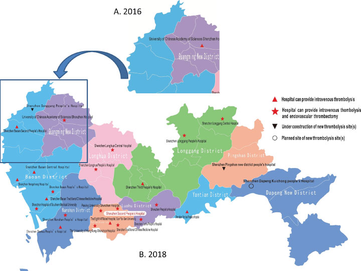 Such thrombolysis maps have been established in multiple areas in China with a positive outcome to increase the thrombolysis rate. Figure 2 demonstrates the development of the first Stroke Emergency Maps established in Shenzheng that was initiated by Dr. Ren. Part of the 2016 version of this map is presented in Figure 2A and clearly indicates areas that lack stroke care resources. Efforts were taken to increase the number of sites in the under-served areas indicated in this figure. In the new 2018 version of the map (Figure 2B), centers that have thrombectomy capabilities are clearly indicated and sites undergoing construction or planned are also indicated. There is an official certification process for the approval for these sites. The new site of Shenzhen Baoan Second People's hospital noted in the square window in Figure 2, although it is not certified for thrombectomy yet, the service has started with the guidance of the experts from certified centers.