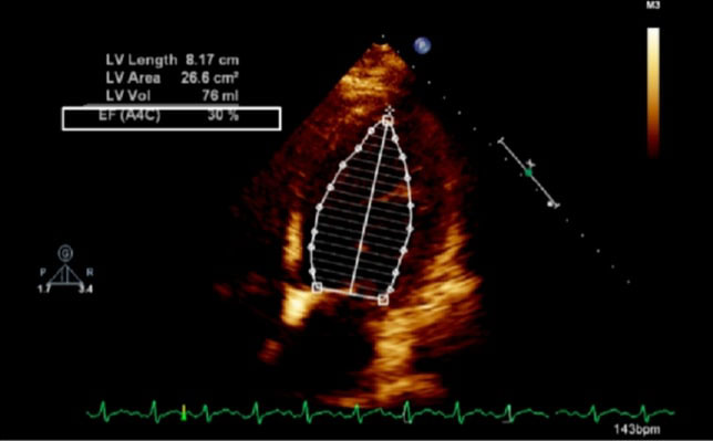 Figure 1: Echocardiogram of apical four chamber view of the heart showing dilated left ventricle and reduced ejection fraction; LV: left ventricle, EF: ejection fraction, A4C: apical four chamber, Vol: volume.