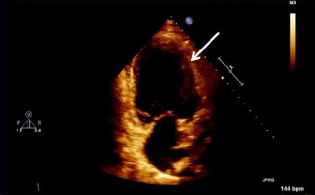 Figure 2: Echocardiogram of apical four chamber view of the heart, depicting left ventricular wall hypertrophy (white arrow).