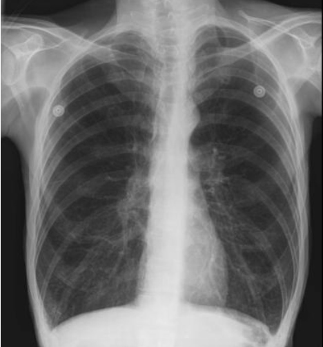 Figure 2: Representative chest X-ray of bronchospasm. During acute bronchospasm there is hyperinflation of the lungs with compression of the heart into a tubular shape and displacement of the diaphragm in a caudal direction. The increase in intrapulmonary pressure may lead to decreased venous return to the heart and a decrease in cardiac output.