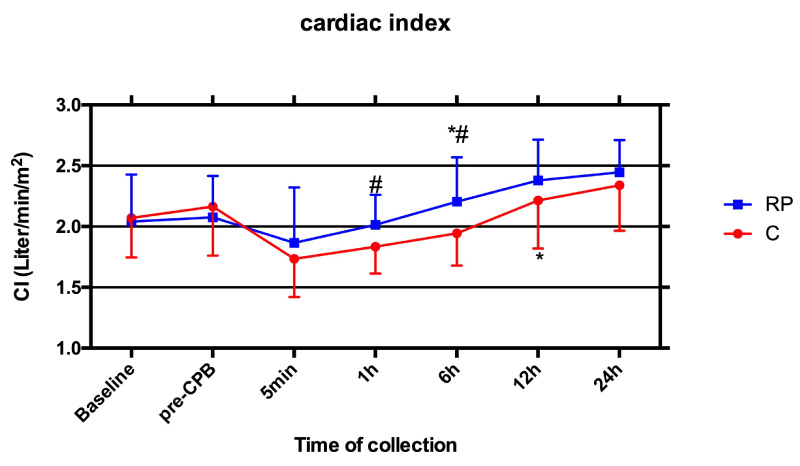 Patients' hemodynamics heart rate (HR), mean arterial blood pressure (MAP) and central venous pressure (CVP) over time did not significantly differ between groups. Cardiac index (CI) value was significantly higher at 6 h after reperfusion in RP group compared to baseline or pre-CPB values (P < 0.05). However, CI improvement in C group occurred 6 h later than RP group. CI value was significantly higher in RP group than that in C group (P < 0.05) during early reperfusion (1h and 6 h post-ACC) (Figure 1).