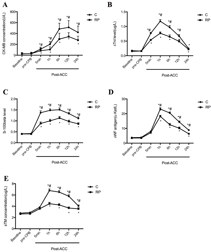 Baseline and pre-CPB serum levels of CK-MB, cTnI, S-100β, vWF and sTM did not differ between groups, but concentrations of all the above parameters significantly increased upon reperfusion at 5 min post-ACC and onwards (P < 0.05 compared with Baseline and pre-CPB). Level of CK-MB peaked at 12h, S-100β peaked at 6h and cTnI, vWF and sTM peaked at 1h post-ACC, respectively in both RP and C groups. After reperfusion, plasma CK-MB, cTnI and S-100β concentrations in group RP were significantly lower than that in group C respectively (P < 0.05). Serum levels of CK-MB, S-100β and cTnI was significantly increased in both the RP group and C group starting from 5 min post-ACC while significant elevation of vWF and sTM levels were not apparent until after 1h post-ACC (All P < 0.05 vs. C, Figure 4) in both groups and the values of vWF and sTM in RP groups was significantly lower than that in C group.