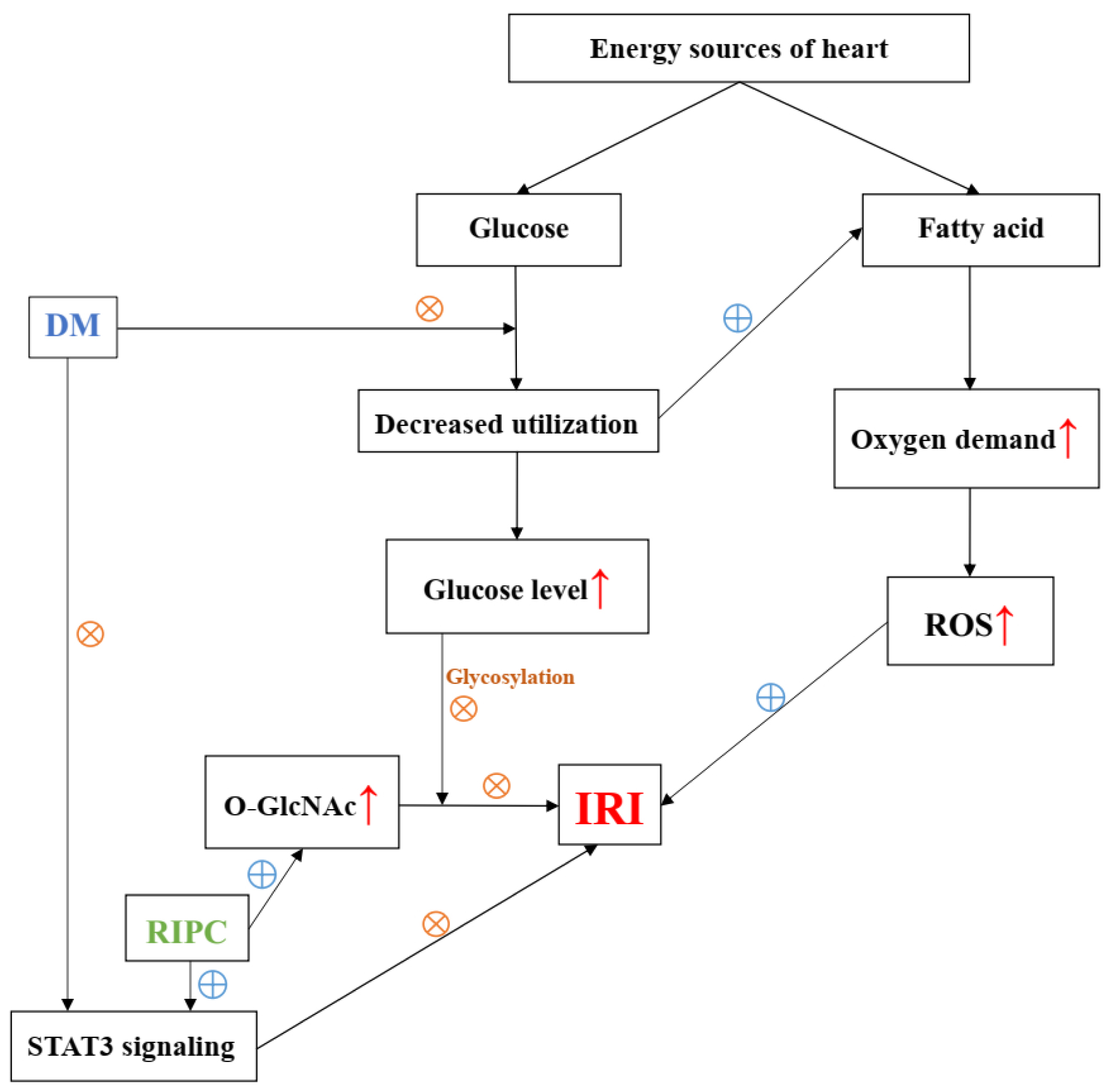 Diabetes would significantly abolish the cardioprotective effect of RIPC. In diabetic state, greater oxygen demand, mitochondrial uncoupling, reactive oxygen species (ROS) overproduction, and mitochondrial dysfunction, increases susceptibility to ischemia-reperfusion injury. The decrease in the release of humoral cardioprotective factors, O-GlcNAc signaling pathway, and also neural pathway damage might explain for attenuated cardioprotective effects of RIPC [68]. The possible mechanisms were summarized in Figure 3.