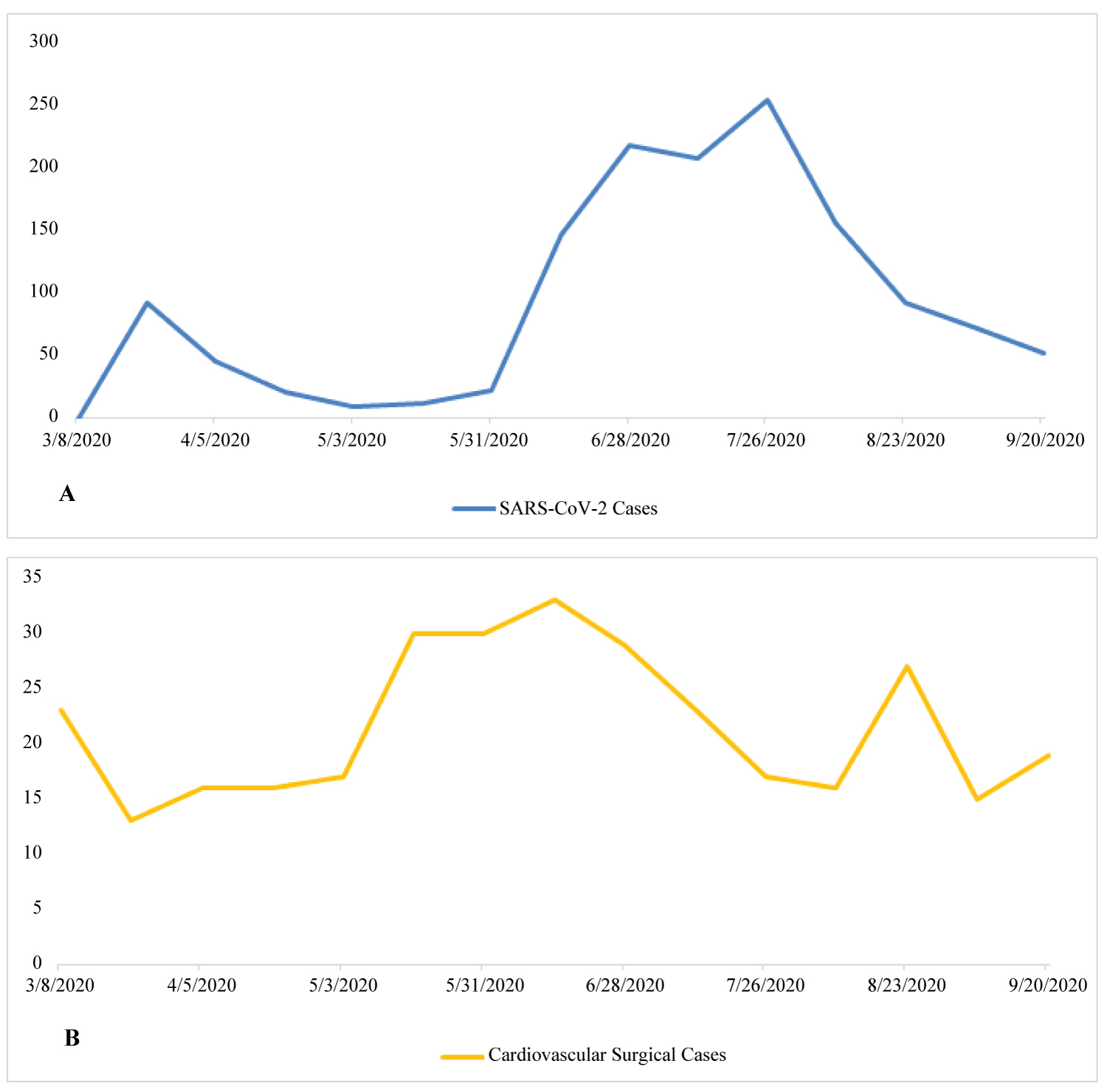 Figure 1: (A) Trend of severe acute respiratory syndrome coronavirus 2 (SARS-CoV-2) cases at one institution over time during coronavirus disease 2019 (COVID-19) pandemic. The Y-axis is the number of COVID-19 patents; (B) The cardiovascular cases performed during the same period of time. The Y-axis is the number of cardiovascular cases.