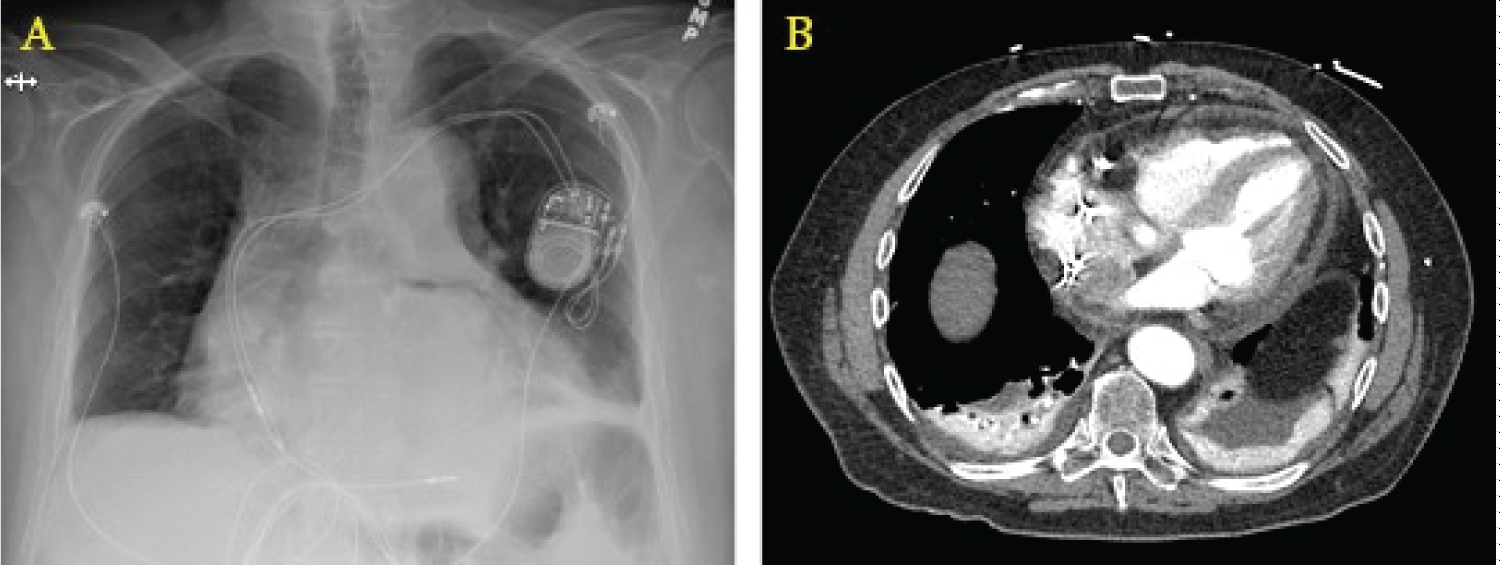 Figure 2: Radiographic findings of AEF. (a) Widened mediastinum on chest X-ray; (b) Computed tomography showing pneumopericardium with air tracking up the ascending aorta.
