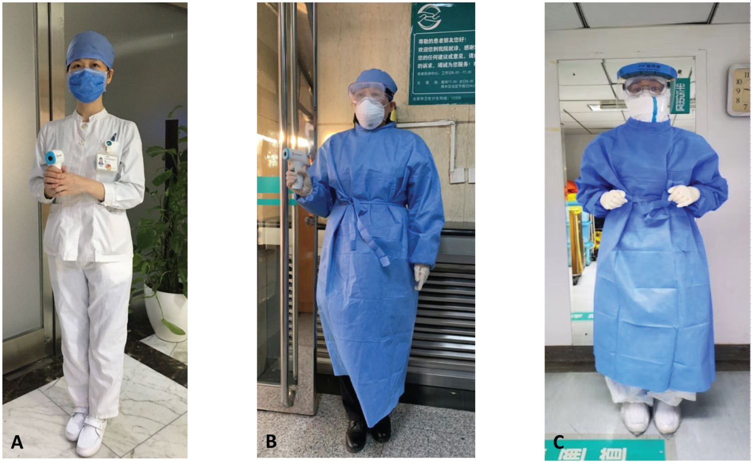 Figure 1: Personal protective equipment (PPE) use indifferent protection level. (A) Level I protection; (B) Level II protection; (C) Level III protection.