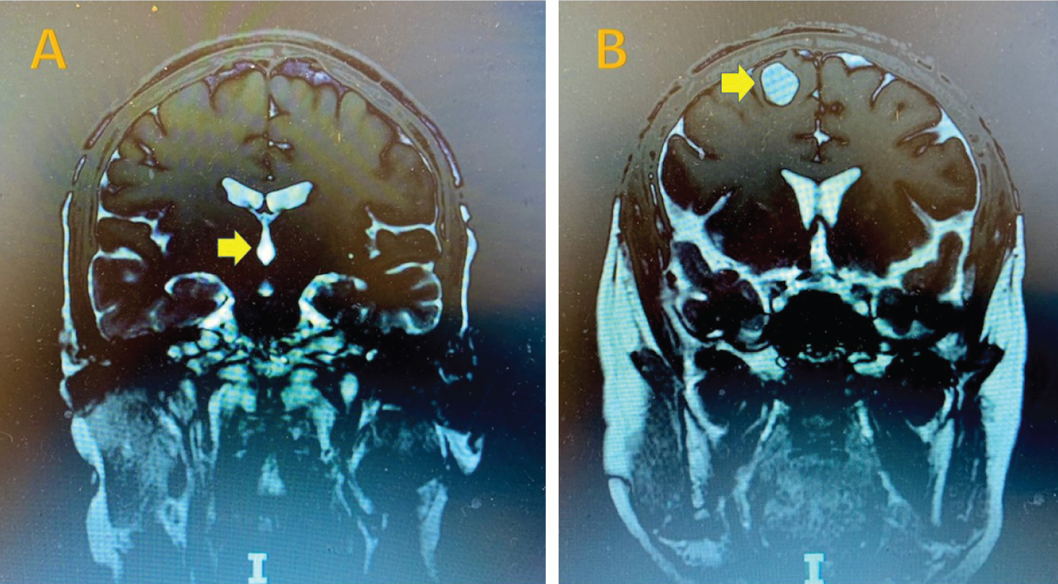 A thirty-year-old male patient from Honduras with a history of chronic HA was in his usual state of health until he experienced two generalized tonic-clonic seizures. He was treated with the anti-seizure medication levetiracetam and dexamethasone for epilepsy and presumed brain inflammation from NCC. He was subsequently referred to our hospital for further evaluation. The brain MRI revealed two major lesions: A viable parenchymal cyst lesion (14 × 17 × 20 mm) in the right frontal lobe with surrounding edema and an intraventricular cyst lesion within the fourth ventricle. There were also multiple calcified brain lesions in subarachnoid space (Figure 1). He was found to be positive for cysticercus antibodies but HIV, toxoplasma, strongyloides, histoplasma, cryptococcus and TB titers were all negative. His lab results, examination and imaging studies confirmed the patient's diagnosis of neurocysticercosis.