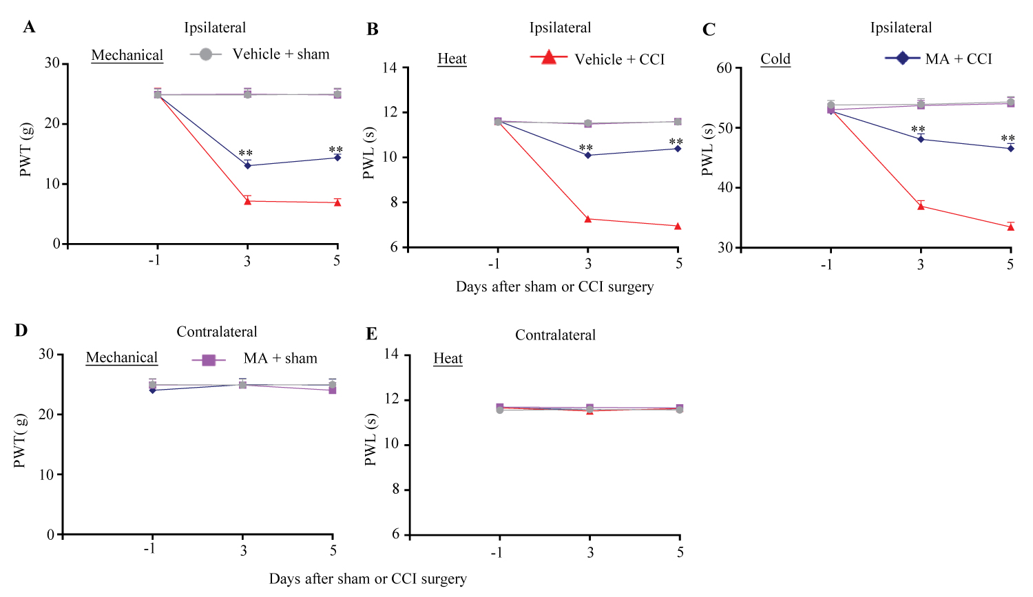 Our previous study showed that intrathecal administration of the specific FTO inhibitors significantly mitigated the development of SNL-induced nociceptive hypersensitivity in male rats [12]. To examine whether the FTO inhibitor had the similar effect in the female rats, we intrathecally administered MA at 20 µg 30 min before CCI or sham surgery and once daily for 5 consecutive days. In line with previous reports [25-28], CCI led to long-lasting mechanical allodynia, heat hyperalgesia and cold hyperalgesia on the ipsilateral, but not contralateral, side in the vehicle-treated CCI female rats (Figure 1A, Figure 1B, Figure 1C, Figure 1D and Figure 1E). On days 3 and 5 post-CCI, paw withdrawal thresholds in response to von Frey filament stimuli and paw withdrawal latencies in response to heat and cold stimuli were significantly reduced as compared to those in the vehicle-treated sham rats (Figure 1A, Figure 1B and Figure 1C). However, these nociceptive hypersensitivities were alleviated in the MA-treated CCI female rats (Figure 1A, Figure 1B and Figure 1C). Paw withdrawal thresholds to mechanical stimulation were increased by 82% and 108% on days 3 and 5, respectively, post-CCI (Figure 1A) and paw withdrawal latencies to heat and cold stimuli were increased by 39% and 30%, respectively, on day 3 post-CCI and by 49% and 39%, respectively, on day 5 post-CCI as compared to the vehicle-treated CCI rats at the corresponding time points (Figure 1B and Figure 1C). As expected, MA at the dosage used did not change basal paw withdrawal responses to mechanical, heat and cold stimuli on the contralateral side of CCI rats and on both ipsilateral and contralateral sides of sham rats during the observation period (Figure 1A, Figure 1B, Figure 1C, Figure 1D and Figure 1E).