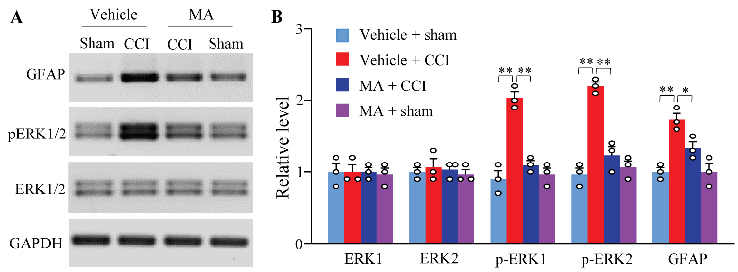 In the dorsal horn, peripheral nerve injury triggered neuronal and astrocyte hyperactivation evidenced by the increases in the levels of phosphorylation of extracellular signal-regulated kinase 1/2 (p-ERK1/2) and glial fibrillary acidic protein (GFAP), respectively [25-28]. To further confirm the effect of intrathecal MA on CCI-induced behaviors, we observed whether intrathecal MA at 20 µg impacted the CCI-induced increases of p-ERK1/2 and GFAP in the dorsal horn. In line with previous studies [25-28], the amounts of p-ERK1/2 and GFAP were remarkably increased in the ipsilateral L4/5 dorsal horn of vehicle-treated CCI female rats on day 14 post-surgery (Figure 3A and Figure 3B). These increases were abolished in the MA-treated CCI female rats (Figure 3A and Figure 3B). Intrathecal MA did not alter the basal expression of p-ERK1/2 or GFAP the ipsilateral L4/5 dorsal horn of sham female rats and of total ERK1/2 in either MA- or vehicle-treated CCI/sham female rats (Figure 3A and Figure 3B).