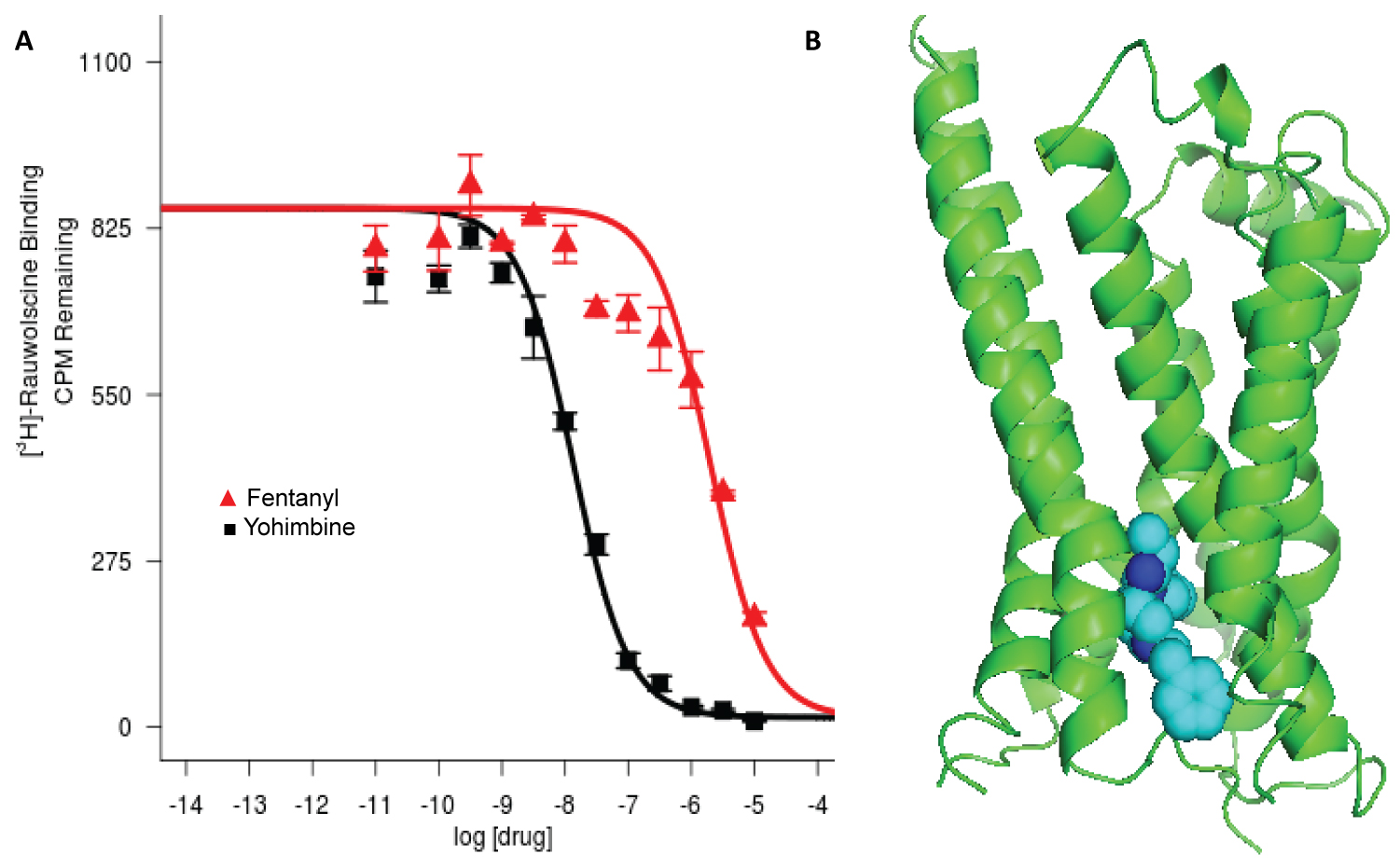 Figure 1: (A) Inhibition of rauwolsine signal (CPM) by increasing concentrations of fentanyl, Ki = 0.95 μM. Yohimbine is used as a positive control. Four repeats were performed as we described previously [6]; (B) Top-ranking docked pose of fentanyl in orthosteric binding pocket of α2B adrenergic receptor.