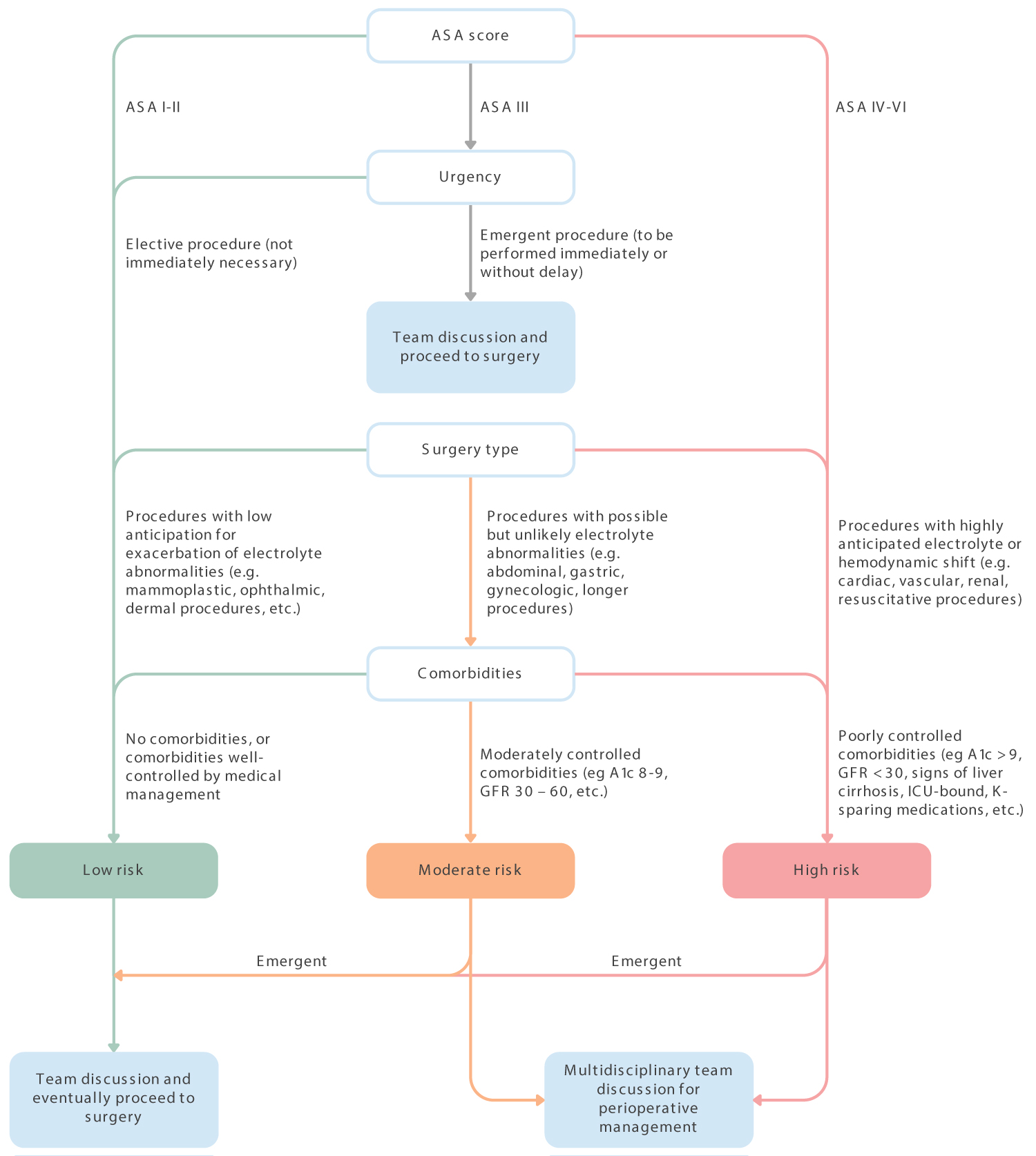 First of all, (1) Stratification should be primarily dictated by ASA classification (I-VI) as well as surgical urgency of the case; emergent cases may often need to proceed regardless of potassium levels while elective cases can be rescheduled if necessary (Figure 1). (2) The surgery type should next direct stratification of cases. Procedures involving cardiac, vascular, or renal systems may be seen as high risk for patients with preoperative hyperkalemia compared to other low-risk types of procedures (melanoma, ocular, breast). In addition to procedures involving certain systems, any additional procedure with anticipated electrolyte or hemodynamic shifts such as transplant, endocrine, and neurosurgical procedures should also be viewed as high-risk. After consideration of surgery type, cases should be stratified by (3) medical comorbidities and degree of control over the comorbidities. Common ones to be considered here include chronic kidney disease, type 2 diabetes mellitus, liver disease, heart failure, chronic infections, and malignancies. As mentioned by Liu, et al., there should be consideration for intraoperative medical management of hyperkalemia via additional IV medications including calcium gluconate and insulin with glucose [11]. With all these factors dictating stratification in management, we finally stress the importance of (4) close communication between surgery, anesthesia, medicine, and all OR staff for patients with hyperkalemia in order to promote a unified approach to how and when to proceed.