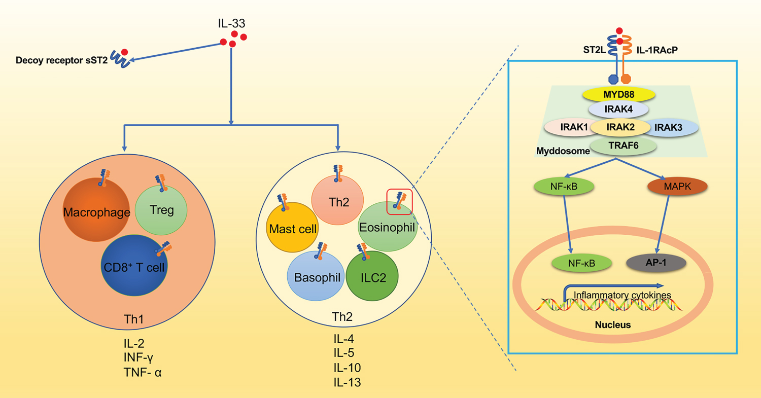 In 2005, Interleukin-33 (IL-33) was identified as a new member of the interleukin (IL)-1 cytokine family [1]. IL-33 is constitutively and abundantly expressed in bronchial and intestinal epithelial cells, endothelial cells, and fibroblasts in human [2,3]. Under resting conditions, IL-33 is localized in the nucleus, as mediated by the presence of an N-terminal domain nuclear localization sequence. Since IL-33 can function both as an intracellular nuclear factor and a conventional cytokine, which makes it a particular characteristic role in transcriptional regulation and activation of the ST2 receptor complex signal. IL-33 has been proposed to be another alarmin with dual functions, similar to HMGB1 and IL-1α. Accumulated experimental evidence indicates that IL-33 is involved in both Th1- and Th2-cells mediated immunity responses and has both pro-inflammatory and anti-inflammatory effects simultaneously [4].