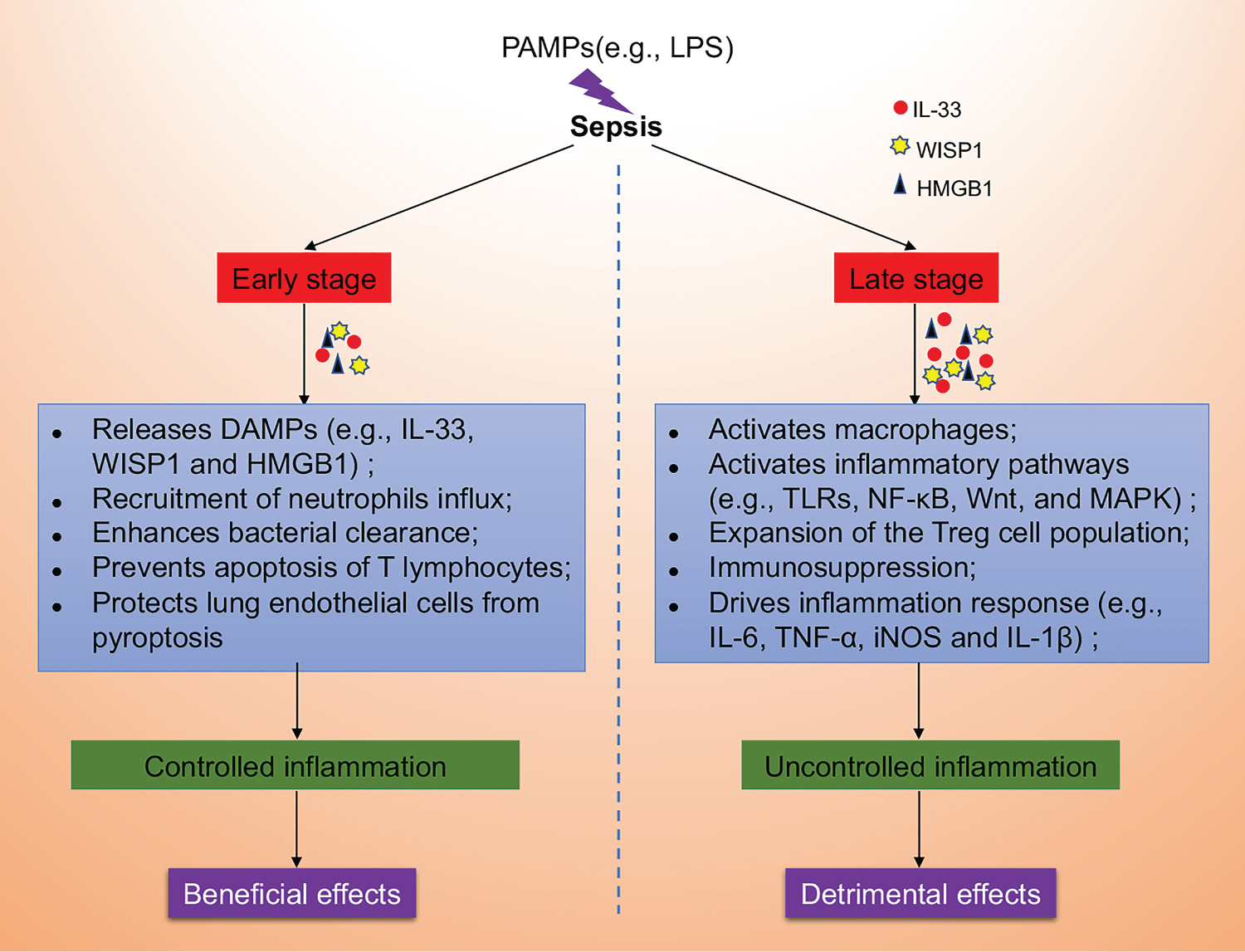 Figure 4: The dual-function of IL-33 in sepsis. We speculate that pathogen-associated molecular patterns (PAMPs, e.g., LPS) induce the release of damage-associated molecular patterns (DAMPs, e.g., IL-33, WISP1 and HMGB1) in the early stage of sepsis, which plays a beneficial role in by recruiting neutrophils influx, enhancing bacterial clearance, preventing apoptosis of T lymphocytes and protecting lung endothelial cells from pyroptosis in controlling inflammation. However, with the development of sepsis towards late stage, the sustainable and increased release of IL-33 may exert detrimental effects through enhanced and uncontrolled inflammation by activating macrophages, activating inflammatory pathways (e.g., TLRs, NF-κB, Wnt, and MAPK), expanding of the Treg cell population, inducing immunosuppression and driving inflammation response (e.g., IL-6, TNF-α, iNOS and IL-1β).