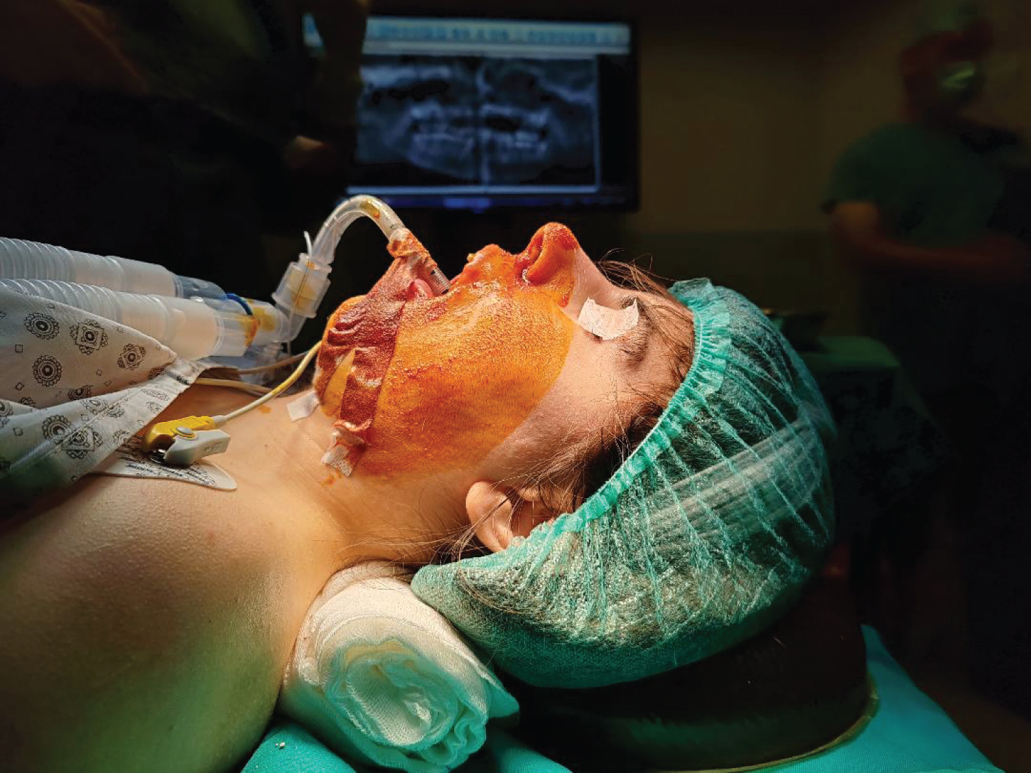 The patient was evaluated preoperatively with a comprehensive multidisciplinary approach. Because of the patient's mental state and poor cooperation, oropharyngeal examination and Mallampati airway scoring were unsuccessful, and the patient's American Society of Anesthesiologists (ASA) physical classification was class II.
