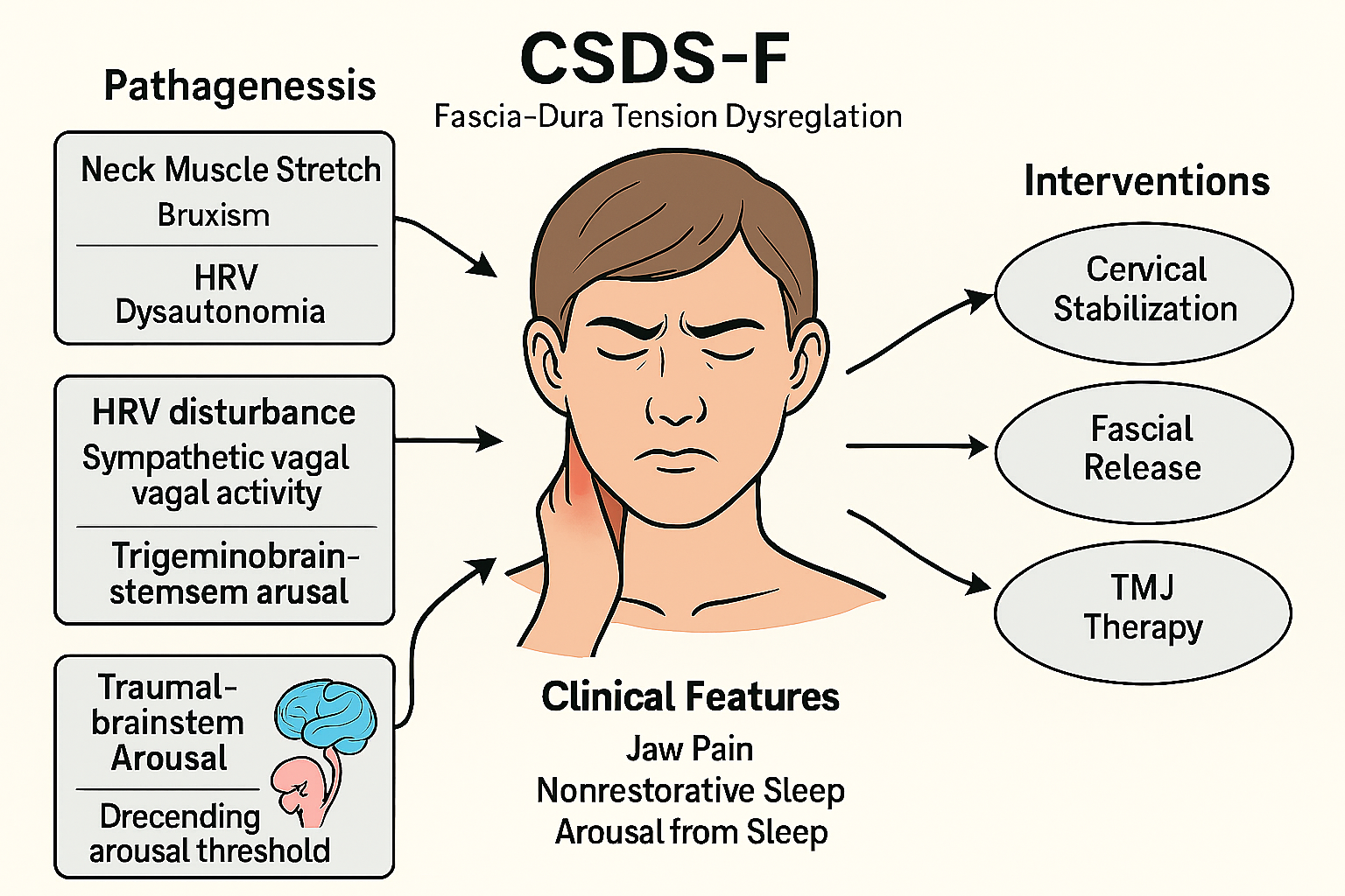 This review proposes a novel subtype-based framework for cervicogenic sleep disorder syndrome (CSDS), grounded in neuroanatomical, autonomic, and fascial mechanisms, to improve diagnostic clarity and therapeutic precision.