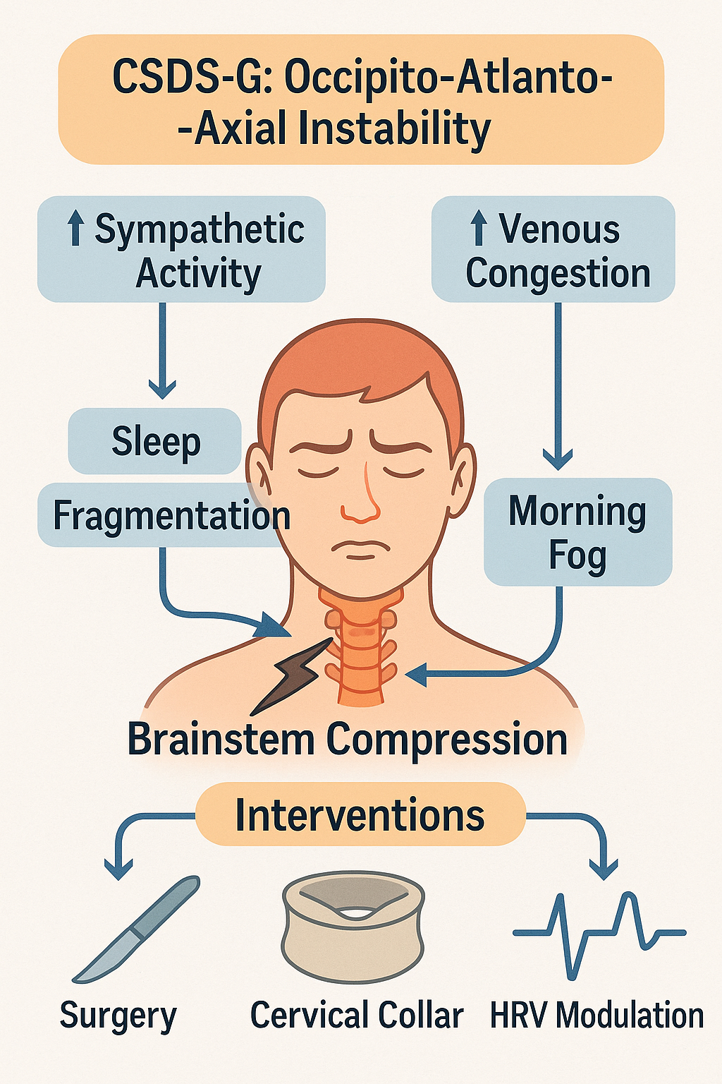 (4) Neurocompression and brainstem dysfunction (e.g., C0-C2 instability causing medullary compression) may reduce arousal thresholds and disrupt respiratory rhythms [61].