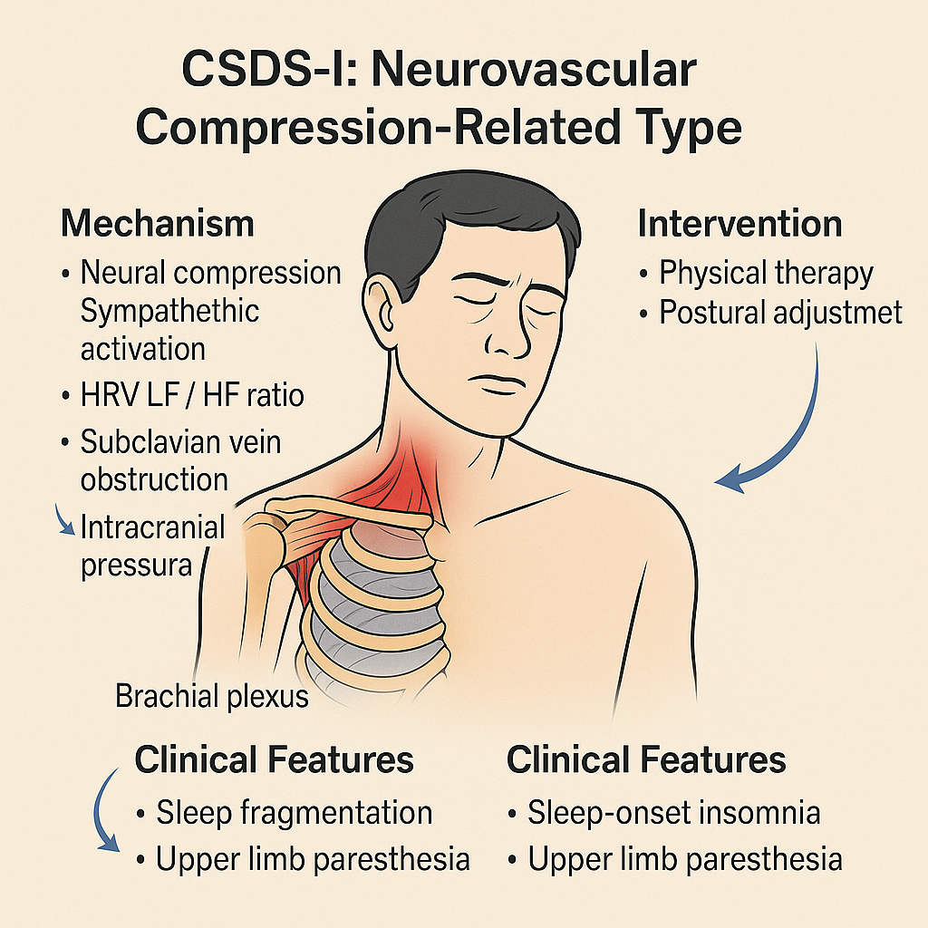 CSDS, as a novel interdisciplinary pathophysiological construct, elucidates how cervical spine and associated soft tissue abnormalities may systematically disrupt sleep architecture and function. It adds an anatomically grounded subtype to the classification of insomnia and supports future work in mechanism-based research, AI-assisted diagnosis, and multimodal therapeutic strategies.