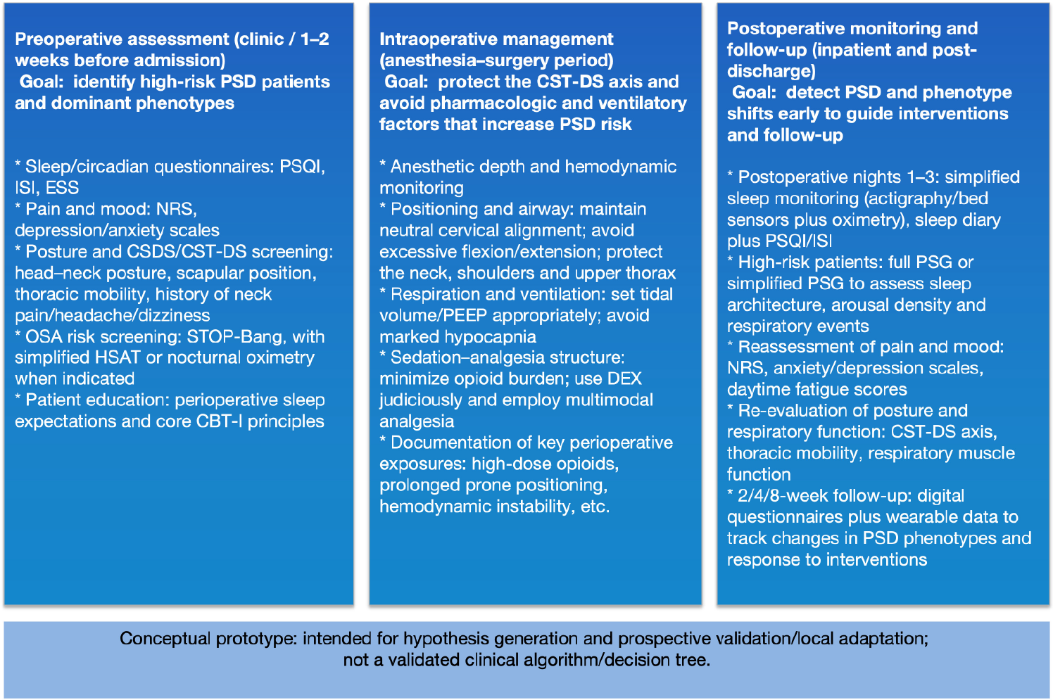 Legend: This figure outlines a pragmatic, perioperative data-capture prototype to support postoperative sleep disturbance (PSD) risk stratification and early phenotype tracking. The preoperative domain focuses on identifying high-risk patients and dominant phenotypes using brief sleep/circadian questionnaires, pain-mood screening, posture/CST-DS screening, and OSA risk assessment. The intraoperative domain highlights exposure control and CST-DS axis protection (neutral cervical alignment, ventilatory parameter optimization, and minimization of high-dose systemic opioids). The postoperative domain emphasizes early detection of PSD and phenotype shifts (nights 1-3 as a simplified monitoring window when feasible), reassessment of pain/mood and daytime fatigue, and longitudinal follow-up (e.g., 2/4/8 weeks) using questionnaires and optional wearable data. This is a conceptual prototype intended for hypothesis generation and prospective validation/local adaptation; it is not a validated clinical algorithm or decision tree.