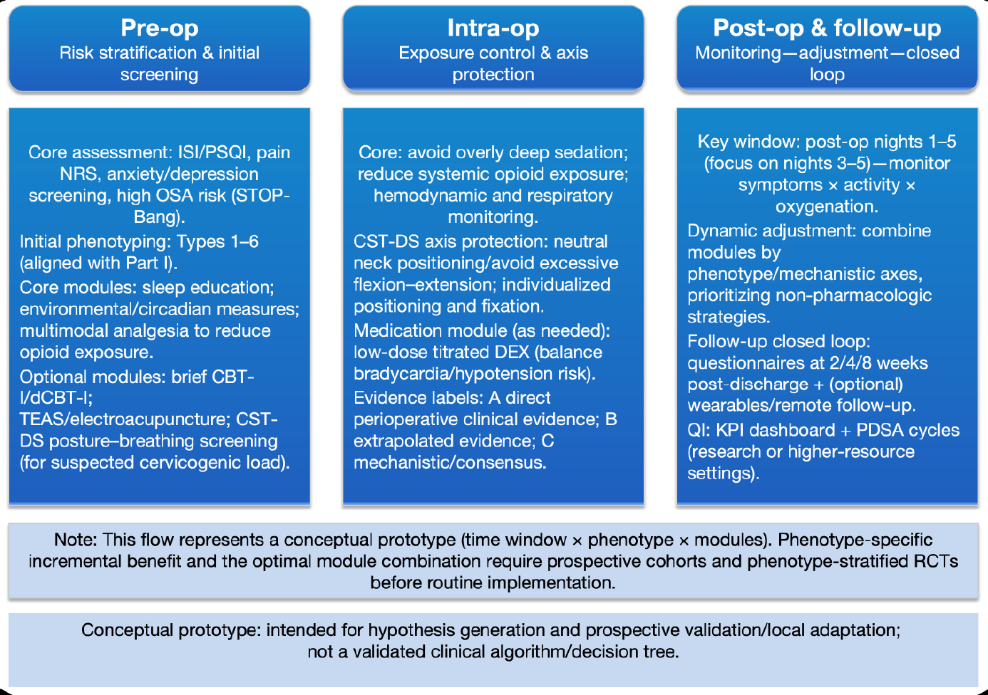 Part II addresses three practical questions: (1) when time is limited, which minimal toolsets best support phenotype pre-screening? (2) how should interventions such as DEX, acupoint/electroacupuncture stimulation, CBT-I, and medications be organized into combinable modules by mechanistic axes and phenotypes, with evidence-tier constraints-(A) perioperative clinical evidence, (B) extrapolated evidence, (C) mechanistic/consensus-applied to both wording and boundaries of use? [13-16] (3) how can digital follow-up and QI methods embed PSD management into preoperative assessment, postoperative follow-up, and institution-level dashboards? [17] For CST-DS-related posture/breathing training, we designate this as an optional, C-level module primarily for patients with suspected cervicogenic load or high posture–ventilation burden; its incremental benefit requires prospective validation [7,8].