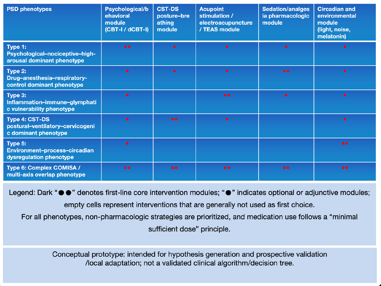 Table 1: Prototype mapping between PSD phenotypes and intervention modules (distinguishing evidence level A vs B/C).