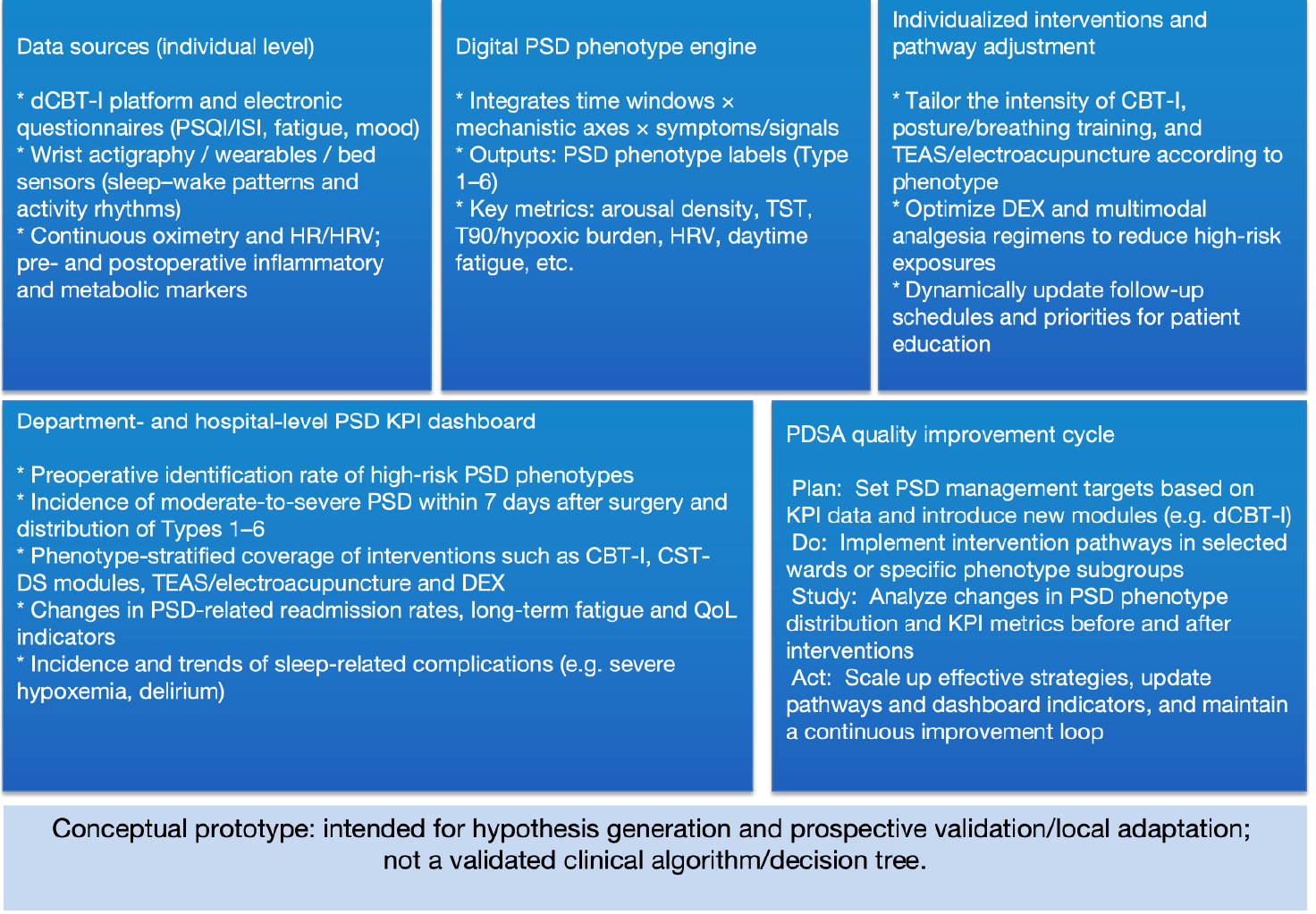 Future work can follow three pragmatic tracks: (1) prospective cohorts collecting multiaxis measures and digital signals to test whether phenotypes “naturally emerge” via unsupervised methods and how they relate to pain, delirium, long-term fatigue, and quality of life; (2) phenotype-stratified validation RCTs comparing combinations of CBT-I, CST-DS-informed rehabilitation, DEX strategies, and acupoint-related interventions, with both incremental benefit and safety endpoints; and (3) development of a shareable minimum dataset and interoperable data structure to enable multicenter QI and real-world research [34-36]. Overall, anchored to the core principles of AASM/ACP/European guidance, the prototype offers an executable, testable, and iteratively refinable blueprint for perioperative PSD management [9-12,33,34].